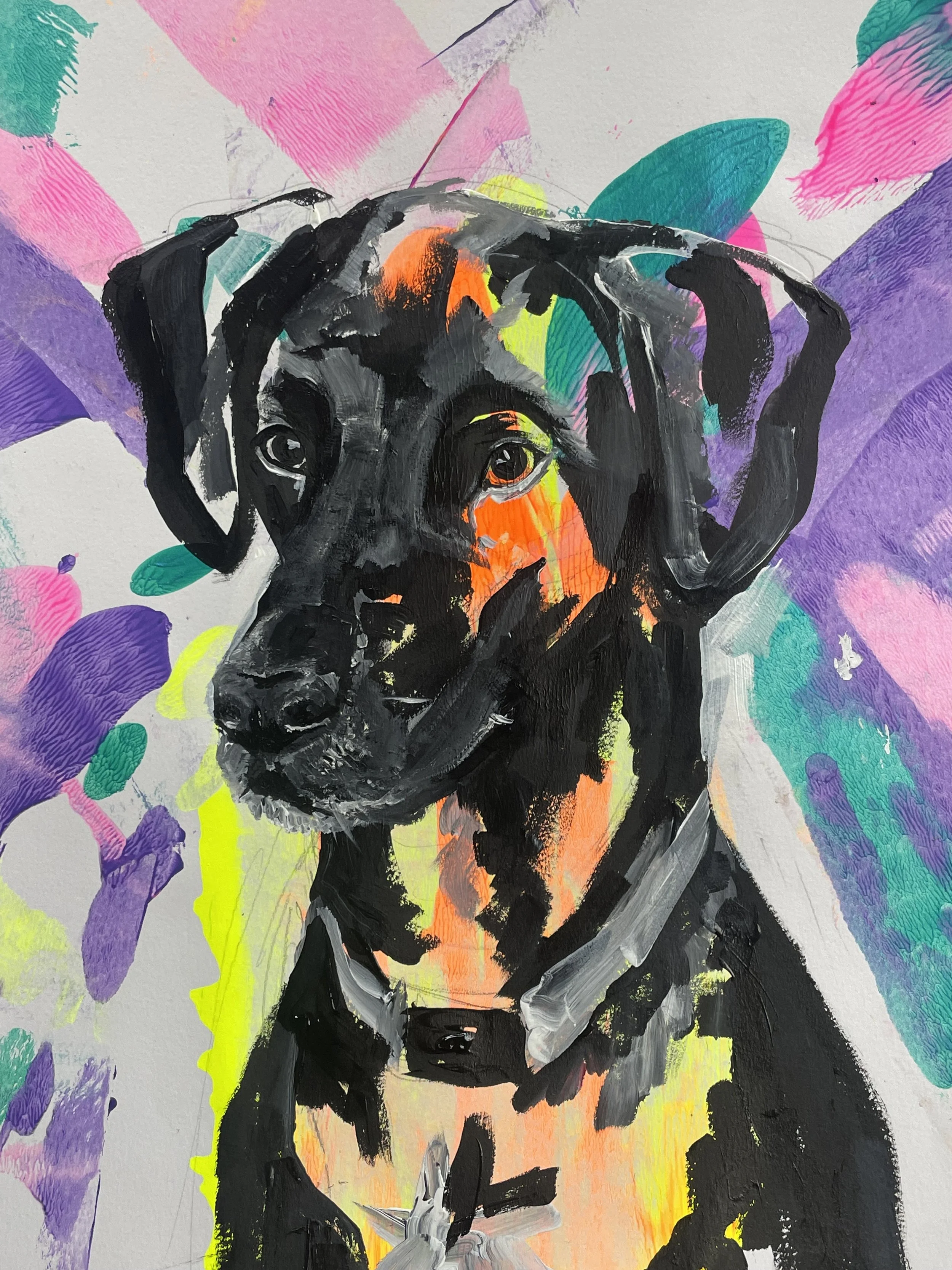 Buddy the dog. Modern take on pet portrait using acrylic. 30cm/20cm.